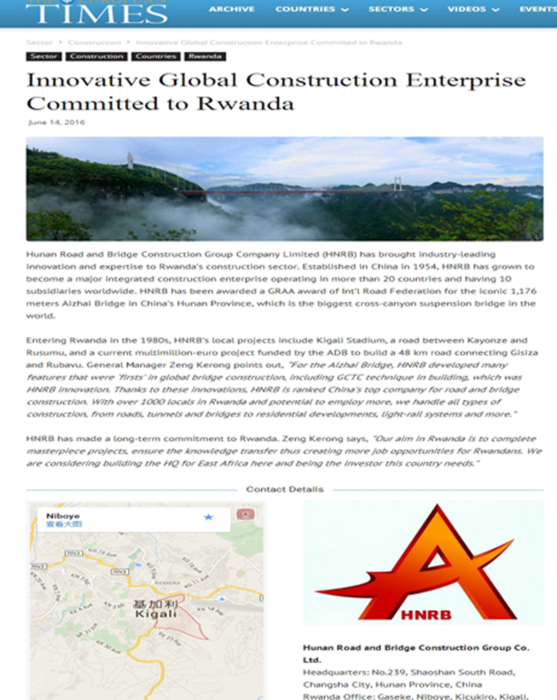 6月14日,歐洲最大的華文日?qǐng)?bào)《歐洲時(shí)報(bào)》以《創(chuàng)新的全球性建筑企業(yè)投身盧旺達(dá)》為題,積極報(bào)道我“湖南路橋”。文章介紹了集團(tuán)基本情況、矮寨大橋的創(chuàng)新及在盧旺達(dá)的施工業(yè)績(jī)等。這將有效幫助集團(tuán)提升國際地位和國際知名度。