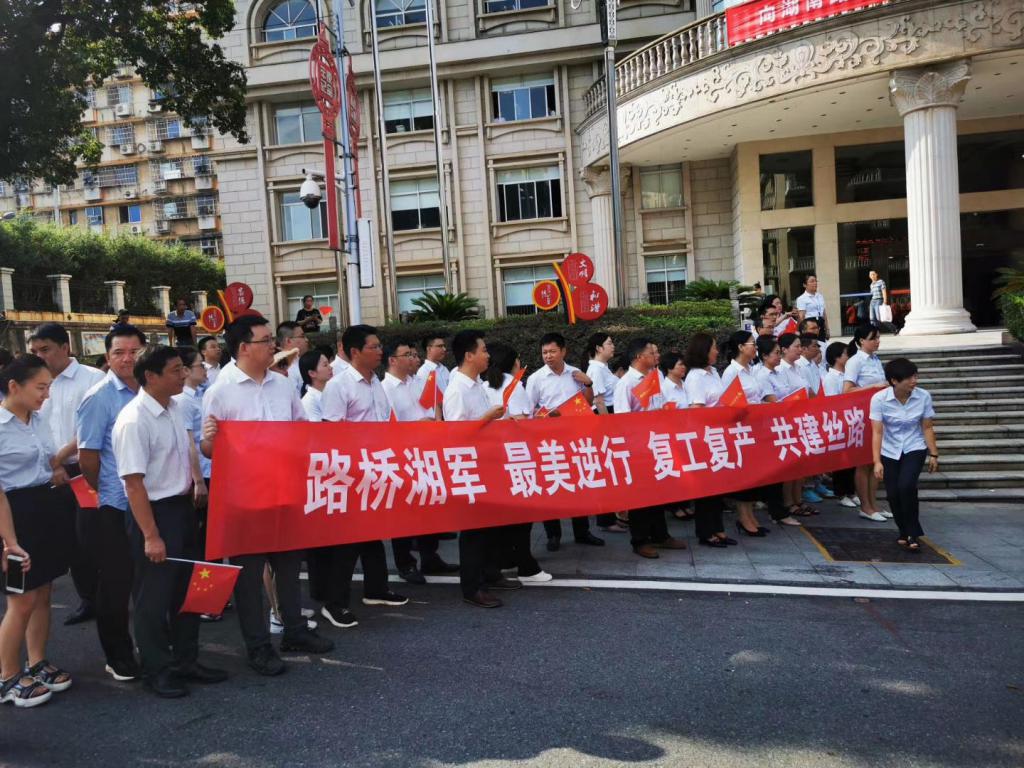 出征儀式上,湖南交水建集團(tuán)領(lǐng)導(dǎo)向赴格團(tuán)組領(lǐng)隊(duì)授 " 赴格魯吉亞復(fù)工復(fù)產(chǎn)先鋒隊(duì) " 隊(duì)旗,省國資委、湖南交水建集團(tuán)和湖南路橋集團(tuán)相關(guān)領(lǐng)導(dǎo)對團(tuán)組成員進(jìn)行慰問,贈送防疫愛心禮包,歡送這群為國際工程履約、奔赴海外的 " 最美逆行者 "。